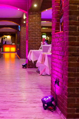 Mit einer schmucken Ambienteausleuchtung Ihrer Oranienburger Hochzeitslocation kann ich ebenfalls aufwarten. Sie besteht aus mehreren, gleichartigen Lampen, sogenannten Floorspots, die auf dem Fußboden entlang der Wände aufgebaut werden. Von dort aus strahlen sie nach oben weg und verleihen dem Saal oder Restaurant in Oranienburg eine festliche Atmosphäre. Wenn sie es wünschen, können die Floorspots in Ihrer Lieblingsfarbe programmiert werden oder mit der Dekoration wie Tischdecken, Servietten oder Blumenschmuck abgeglichen werden.